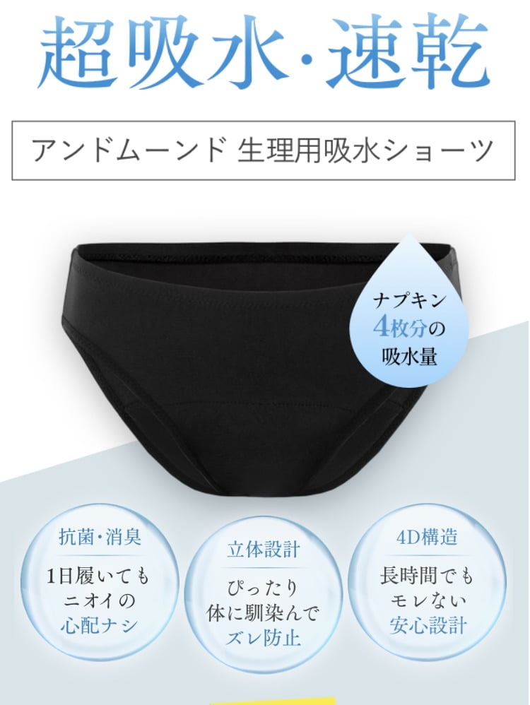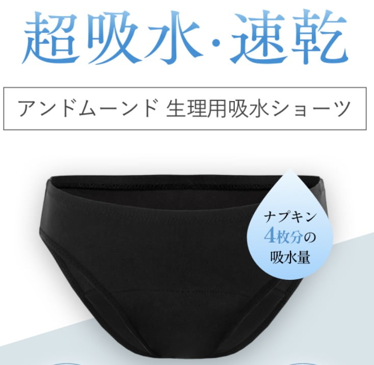 アンドムーンドは女性のツラい生理期間を快適に過ごせるように開発された超吸水・速乾の吸水ショーツ。