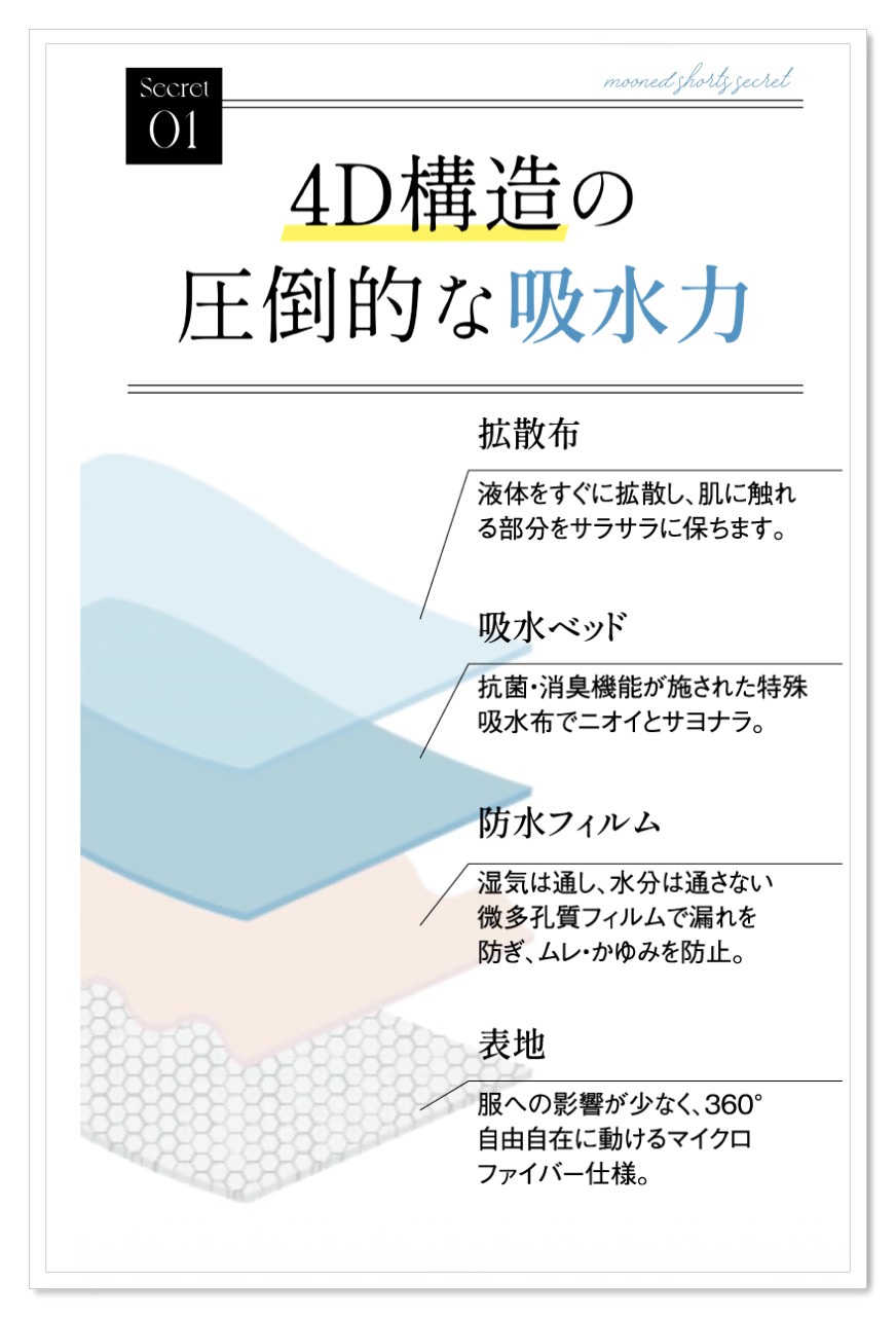 ナプキンをショーツに当てなくてもアンドムーンドの昼用ナプキン4枚分の吸収力を持つ吸収体がしっかり経血を吸収。