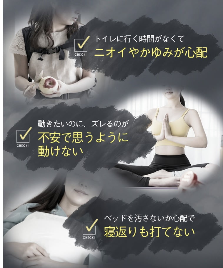 | こんな悩みに対応 | 生理中にズレるのが不安で動きにくい、かぶれにニオイや漏れが心配、近くにトイレがないと不安、など |