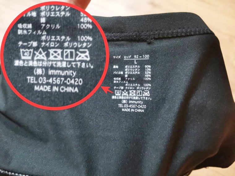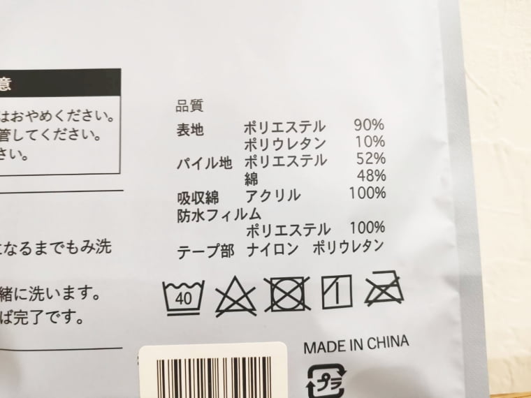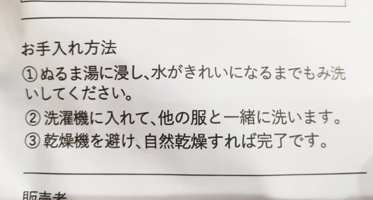 パッケージの裏にはお手入れ方法や生地の素材など大切な情報が記載されています。