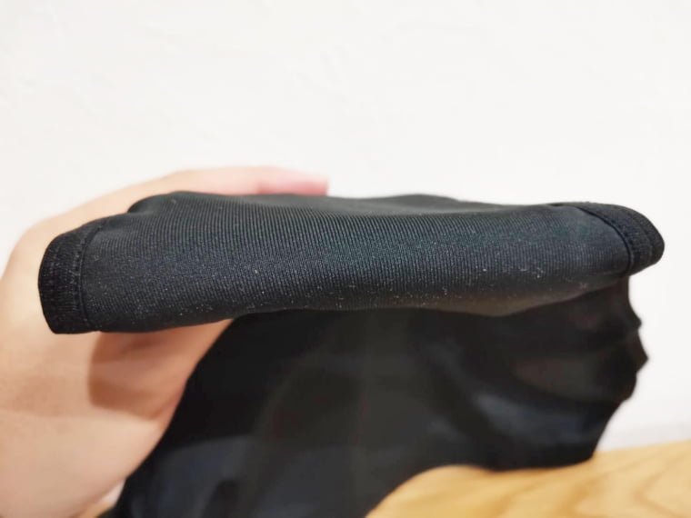 伸縮性もチェックするために左右に伸ばしてみたら、戻る力もしっかり感じながらもこのようにしっかり伸びます!