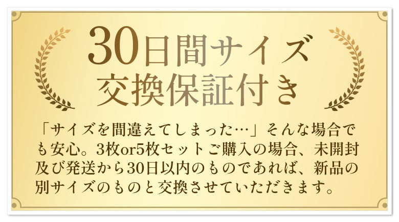 | 保証 | 30日間サイズ交換保証 (3枚or5枚セット購入者) |
