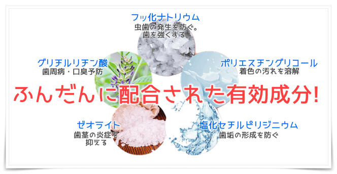効果効能 歯周炎(歯槽膿漏)の予防、歯肉(齦)炎の予防、歯石の沈着を防ぐ、虫歯の発生及び進行の予防、口臭の防止、タバコのヤニ除去、歯を白くする、口中を浄化する、口中を爽快にする
