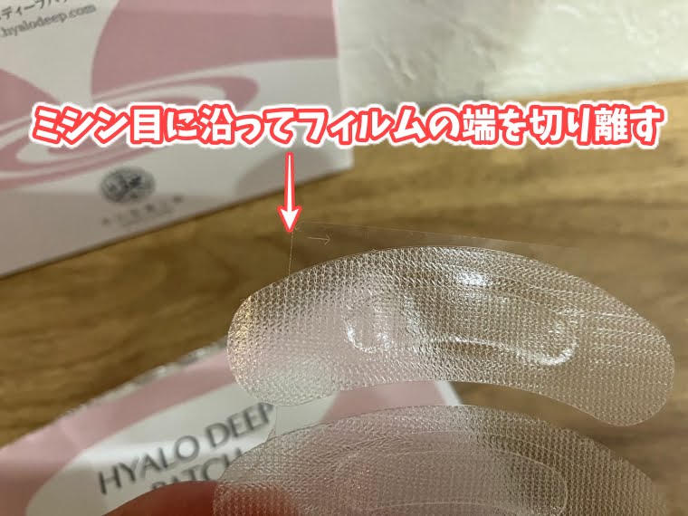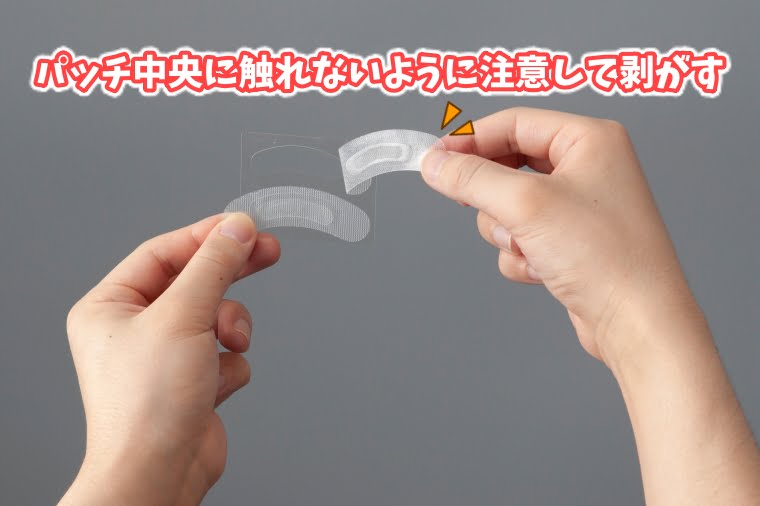 パッチ中央のヒアルロン酸※の針がある部分に触れないように注意しながら、フィルムからはがしていきます。
