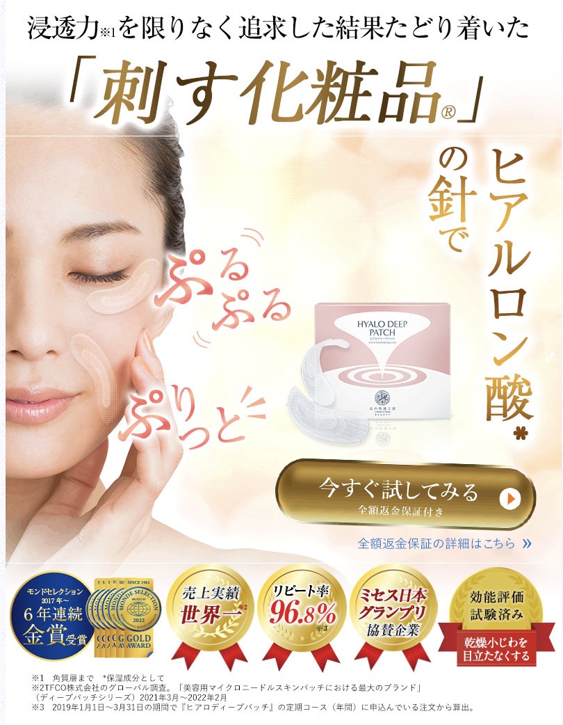 - 私もヒアロディープパッチを使った翌日にはお肌のハリと弾力アップに、セルフケアでは感じたことのない肌のうるおいを実感