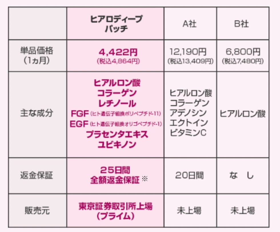 ヒアロディープパッチは、成分や保証、アフターフォローなど、他の類似商品と比較しても圧倒的にお得なアイテム!