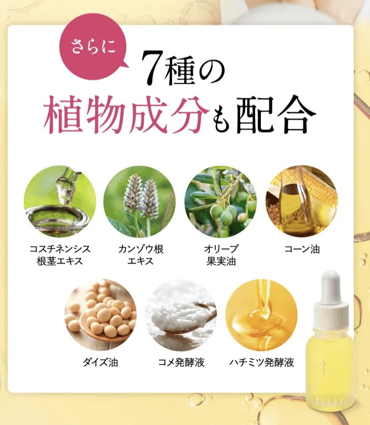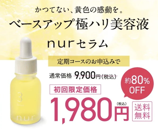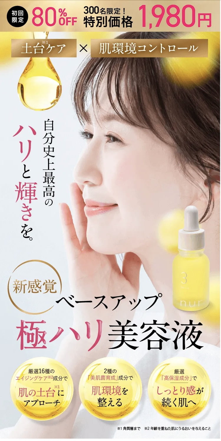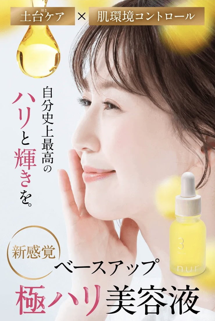 ヌーア(nur)セラムは、「ハリやくすみ、うるおい不足が気になる年齢肌が変わった!」と、口コミでも話題になっている美容液。