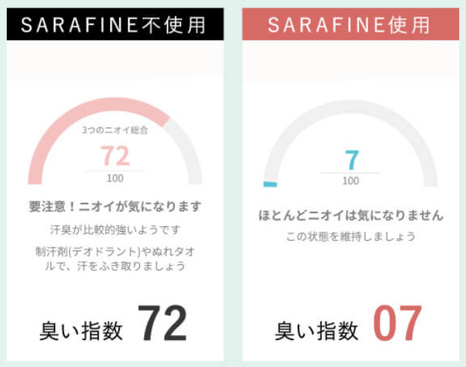 | ニオイの変化 | [jinstar5.0 color=”#ffc32c” size=”14px”]4.8 ※ サラフィネ自体は無香料だけどハーブっぽい香り。事前に塗っておけば、首元からの嫌なニオイはほとんどしない。いい香りというより無臭に近い。 |