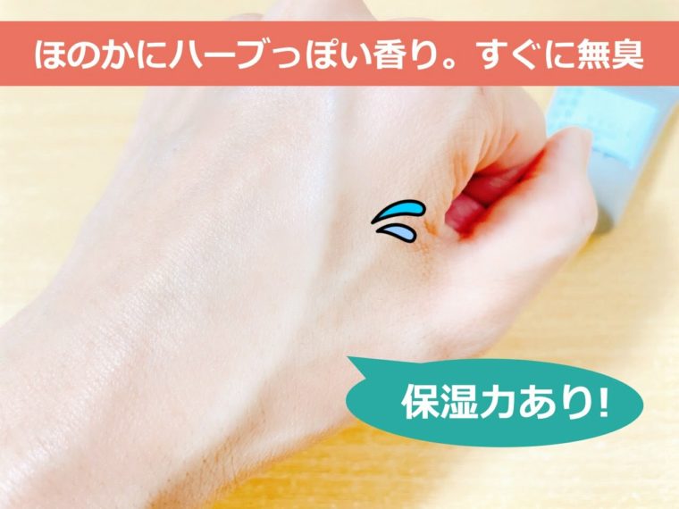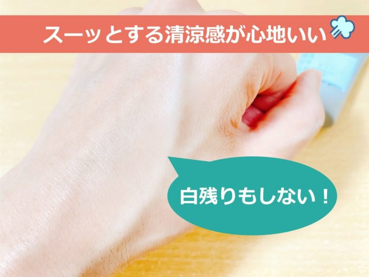 | 使いやすさ | [jinstar4.5 color=”#ffc32c” size=”14px”]4.5 ※ 少しスーッとする冷感があって、汗が引きやすく爽やかな感じ。塗り立てはしっとりして、2分もするとサラッとする。外出先でも使いやすい◎。 |