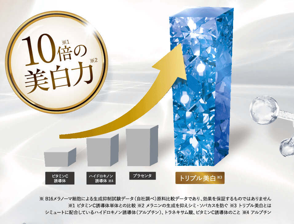 | 特徴 | ・トリプル美白成分 ・卵殻膜&美白菌サポート ・独自ナノ・ラメラ化浸透技術 |