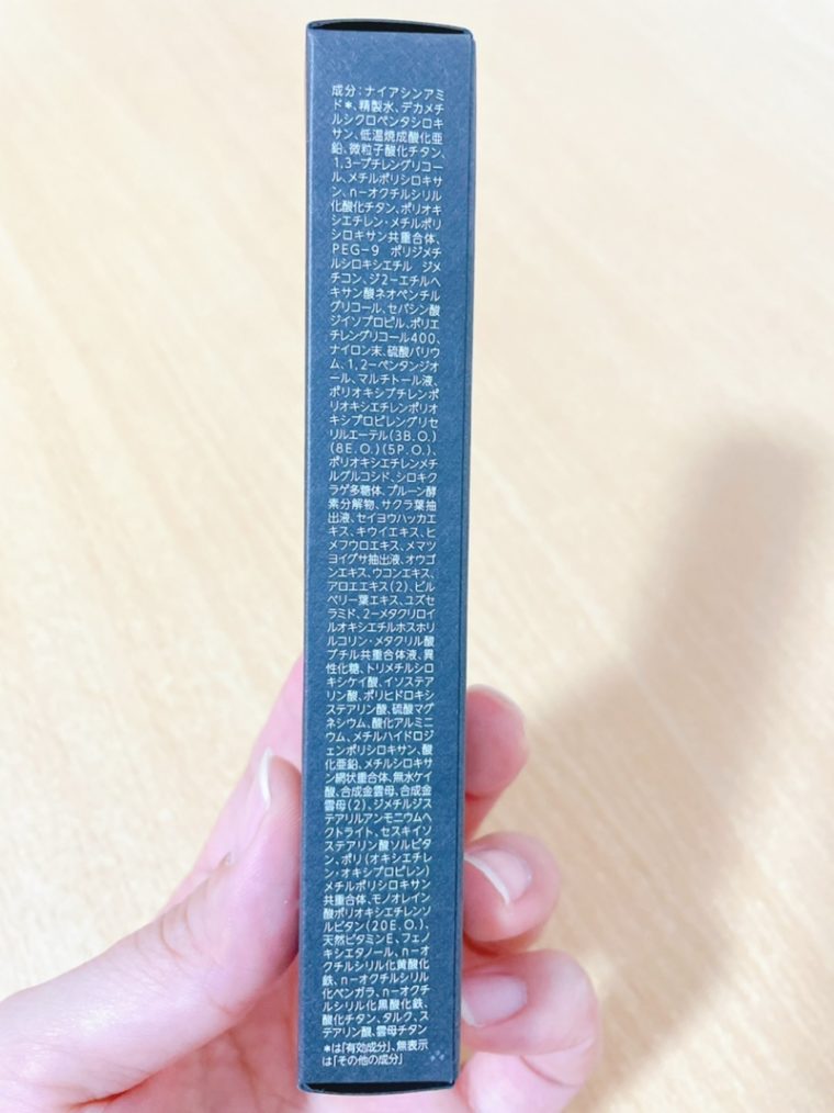 [ac-box01 title=”全成分”]ナイアシンアミド、精製水、デカメチルシクロペンタシロキサン、低温焼成酸化亜鉛、微粒子酸化チタン、1,3-ブチレングリコール、メチルポリシロキサン、n-オクチルシリル化酸化チタン、ポリオキシエチレン・メチルポリシロキサン共重合体、PEG-9 ポリジメチルシロキシエチル ジメチコン、ジ2-エチルヘキサン酸ネオペンチルグリコール、セバシン酸ジイソプロピル、ポリエチレングリコール400、ナイロン末、硫酸バリウム、1,2-ペンタンジオール、マルチトール液、ポリオキシブチレンポリオキシエチレンポリオキシプロピレングリセリルエーテル(3B.O.)(8E.O.)(5P.O.)、ポリオキシエチレンメチルグルコシド、シロキクラゲ多糖体、プルーン酵素分解物、サクラ葉抽出液、セイヨウハッカエキス、キウイエキス、ヒメフウロエキス、メマツヨイグサ抽出液、オウゴンエキス、ウコンエキス、アロエエキス(2)、ビルベリー葉エキス、ユズセラミド、2-メタクリロイルオキシエチルホスホリルコリン・メタクリル酸ブチル共重合体液、異性化糖、トリメチルシロキシケイ酸、イソステアリン酸、ポリヒドロキシステアリン酸、硫酸マグネシウム、酸化アルミニウム、メチルハイドロジェンポリシロキサン、酸化亜鉛、メチルシロキサン網状重合体、無水ケイ酸、合成金雲母、合成金雲母(2)、ジメチルジステアリルアンモニウムヘクトライト、セスキイソステアリン酸ソルビタン、ポリ(オキシエチレン・オキシプロピレン)メチルポリシロキサン共重合体、モノオレイン酸ポリオキシエチレンソルビタン(20E.O.)、天然ビタミンE、フェノキシエタノール、n-オクチルシリル化黄酸化鉄、n-オクチルシリル化ベンガラ、n-オクチルシリル化黒酸化鉄、酸化チタン、タルク、ステアリン酸、雲母チタン[/ac-box01]