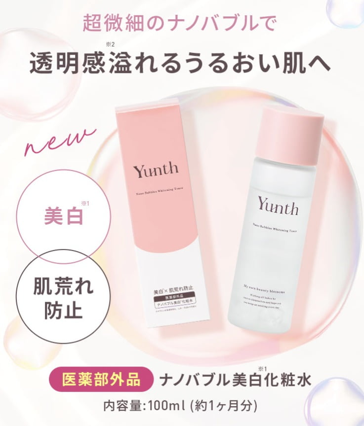 Yunth(ユンス)ナノバブル美白化粧水は、美白とゆらぎにくい肌を目指せる医薬部外品のスキンケアアイテム。
