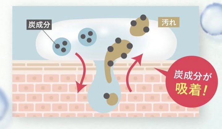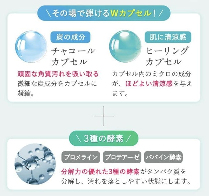 青いチャコールカプセルを潰すと、炭の成分がじゅわっと溶け出し、酵素の力によって浮かび上がった汚れを優れた吸着力でしっかりと吸い出します!