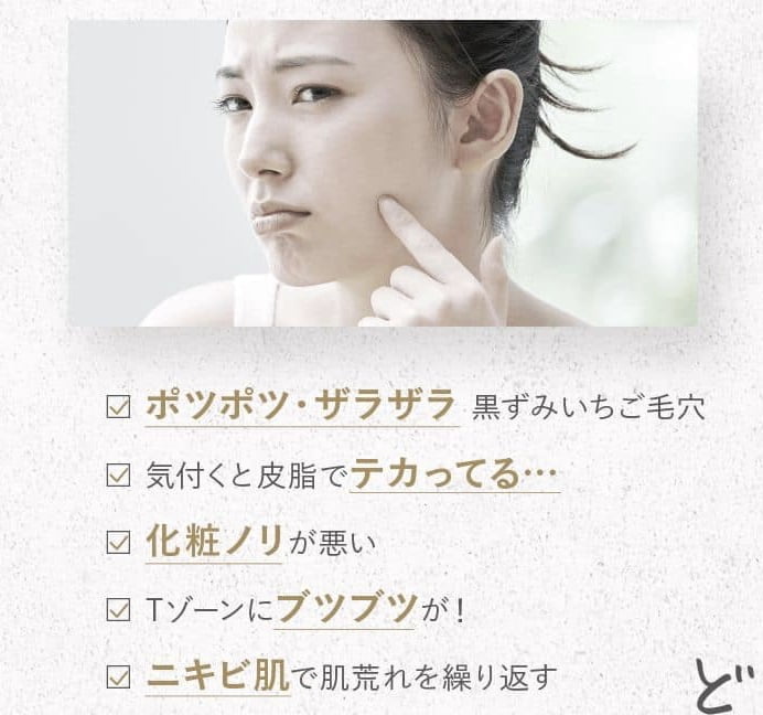 悩み:毛穴の黒ずみ、肌のくすみ、ニキビ、肌の乾燥[/cat_box01]