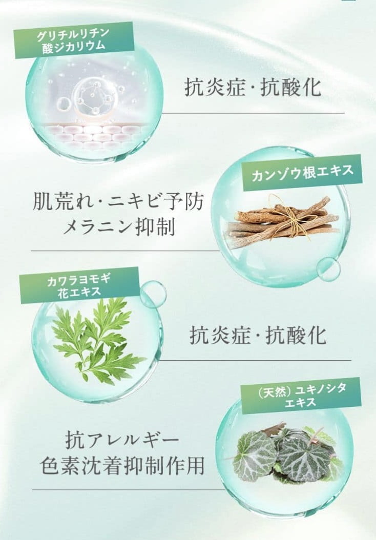 | カンゾウ根エキス | 肌あれ・ニキビ予防、メラニン抑制 |