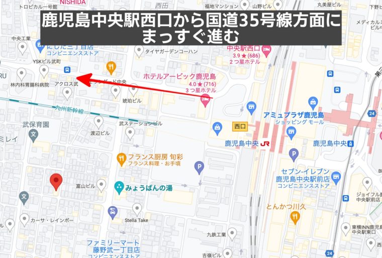 「鹿児島中央駅西口」を出て、ホテルアービック鹿児島を左手に400m程まっすぐに進みます。