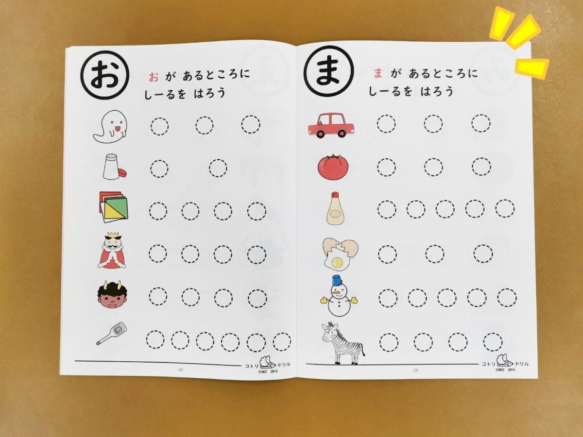 指差しだけだと飽きてきたりするので、対象語を見つけてシールを貼るといった作業をプラスすると、楽しみながらできるのでおすすめ!