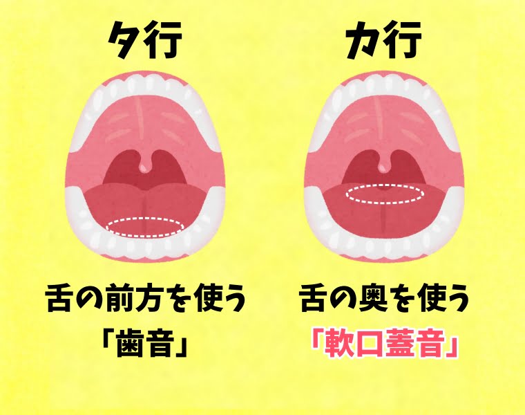 か行は舌の奥の方を、タ行は舌の前方を使う音。