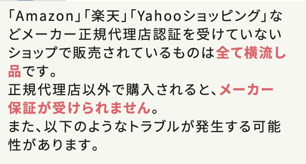 [jin-iconbox01]Amazonや楽天で【正規品】と書いてあっても横流し品であって、【非正規販売店】な店舗がとても多いです。その店で買っても5年保証も30日返金保証も使えないので、買って後悔したくない人は間違わないように注意してください。[/jin-iconbox01]