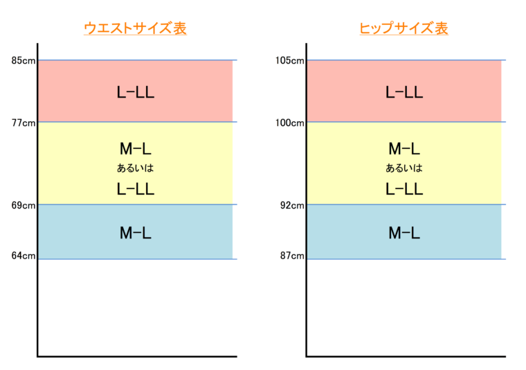 | サイズ | [M−Lサイズ] ウエスト:64〜77㎝ ヒップ:87~100㎝ [L–LLサイズ] ウエスト:69〜85㎝ ヒップ:92~105㎝ |