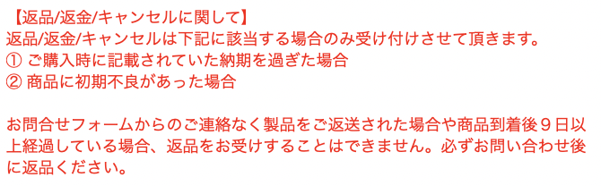 「イメージと違った…」といった、購入者都合で交換することはできませんが、納期が過ぎた場合商品が不良品であった場合に返品することができます。