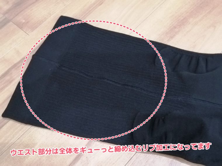 お腹〜ウエスト部分には、全体をギューーっと締め込むリブ編みが施されていて、よりコンパクトなくびれが形成されるような加工になっています。