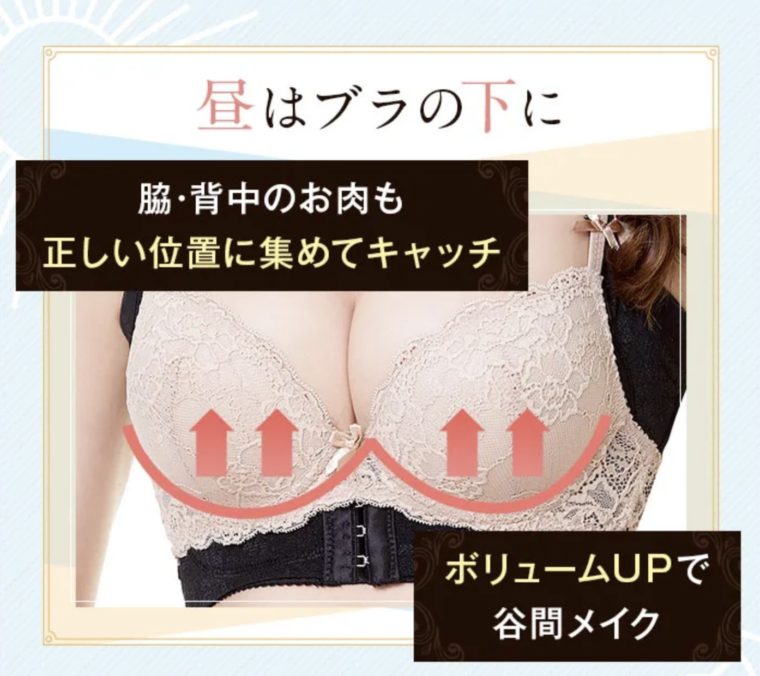 昼はブラの下に着けてボリュームアップ、夜はブラの上から着けて美バストメイクができなど、昼夜使える2段階美補正ができちゃうバストリフターのようですね。
