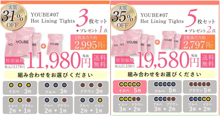 YOUBE(ユービー)タイツは大手ネット通販ではなく、公式サイトで注文するとオトクな特典つきの最安値で購入することができます。