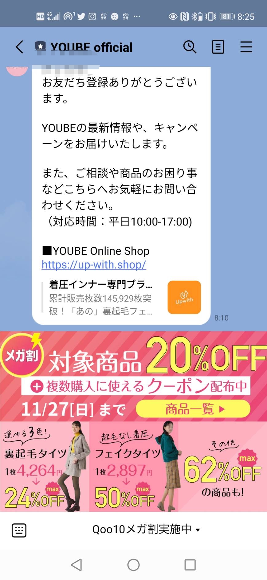 クーポンやキャンペーンなどYOUBEのオトクな情報は、公式LINEに登録すると随時送られてきます。