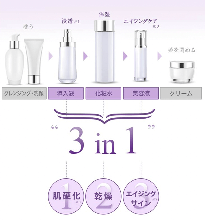 | 特徴 | 3in1(導入液/化粧水/美容液) |