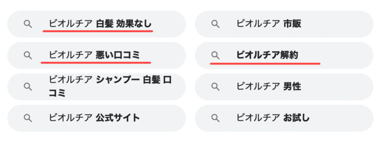 ネガティブな口コミが多いからなのか「ビオルチア 悪い口コミ」や「ビオルチア 白髪 効果なし」といった気になる検索候補が表示されてます。