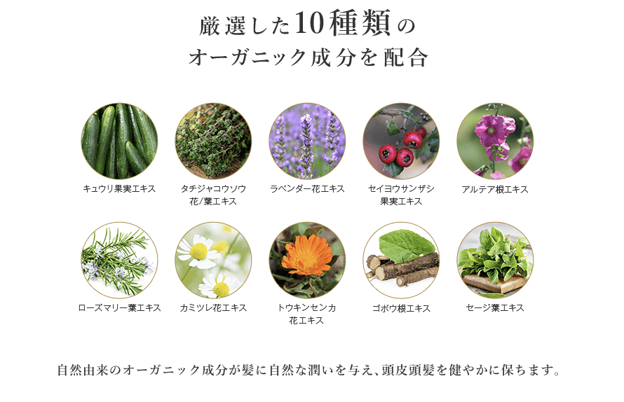 厳選したオーガニック成分を10種類も配合し、洗うだけでハリ・コシ・ツヤのある美髪へサポート。