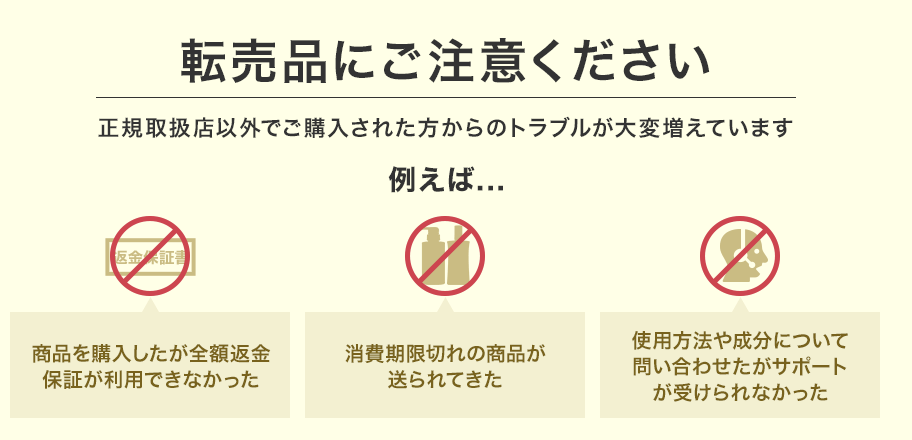 こういったトラブルからくるストレスは、肌や髪にも負担がかかるので、新品正規品を変えて保証もしっかり利用できる公式サイトでの購入をおすすめします。