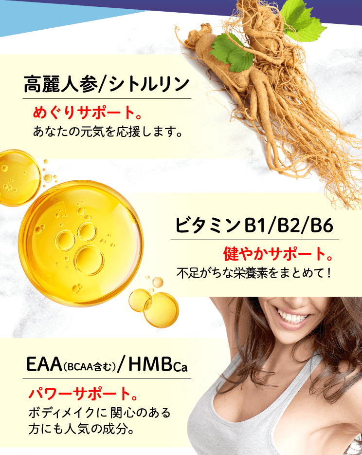 サポート成分 めぐりサポート:高麗人参/シトルリン
