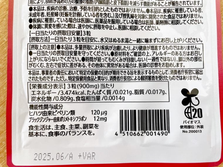 | 成分表示 | 3粒(900mg)あたり エネルギー:3.474kcal たんぱく質:0.021g 脂質:0.017g 炭水化物:0.809g 食塩相当量:0.0014g |