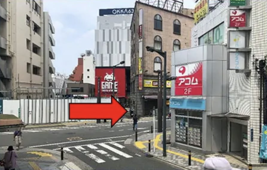 階段下に行くとアコムが見えるので右折し、しばらくは直進します。