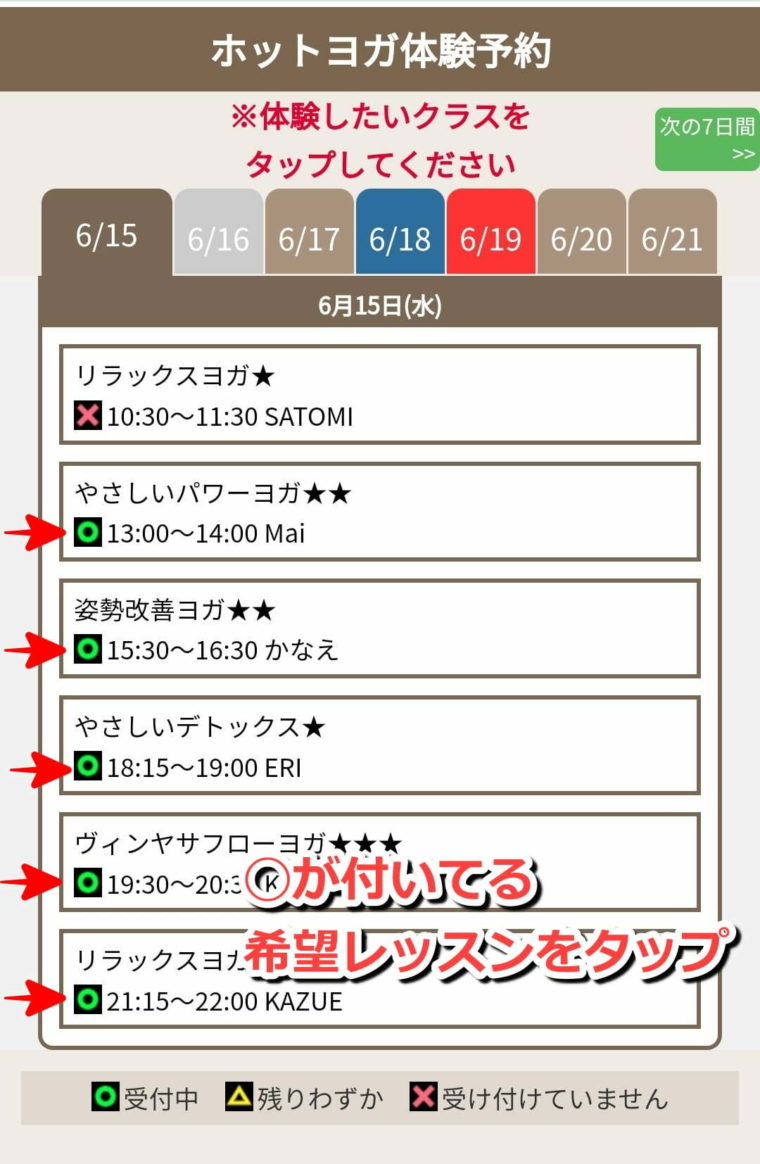 A:体験レッスンの予約で「◯」がついているレッスンはどれでも参加可能です。