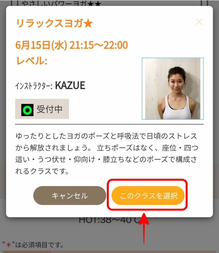 ウェアに着替えたら、希望したホットヨガレッスンを実際に体験していきます。