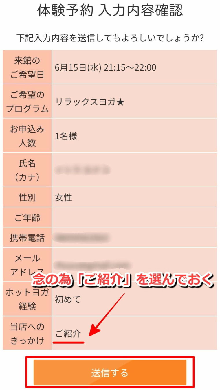 ⑥名前やメールアドレスなどの必要項目入力後に「送信する」をタップ